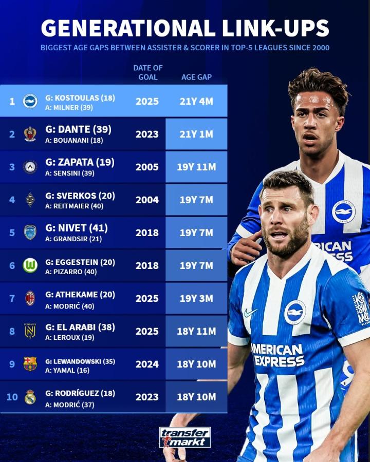 1. 进球者:科斯图拉斯(18岁),助攻者:米尔纳(39岁) 年龄差21年4个月(2025年-布莱顿)